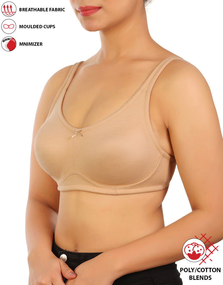 Dies ist ein nahtloser Minimizer-BH mit geformten Cups und hervorragendem Halt. Er bietet perfekten Support, während der gemischte Baumwollstoff ein sehr angenehmes Gefühl auf der Haut verleiht. Das Material ist atmungsaktiv und die Power-Mesh-Flügel verleihen dem BH eine elegante Note. Die vorderen Träger sind leicht gepolstert für besseren Halt und Komfort. Die mittelhohe Mitte sorgt für vollständige Abdeckung ohne Auslaufen.