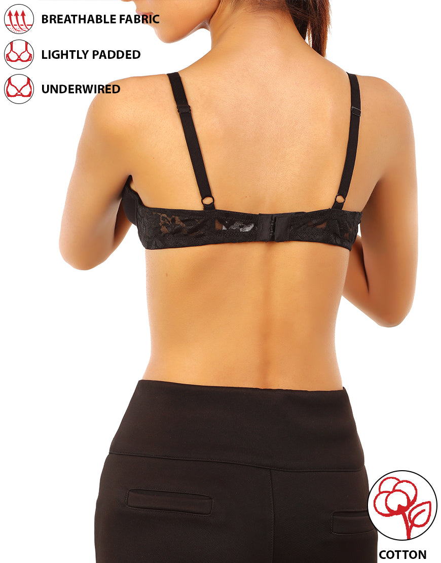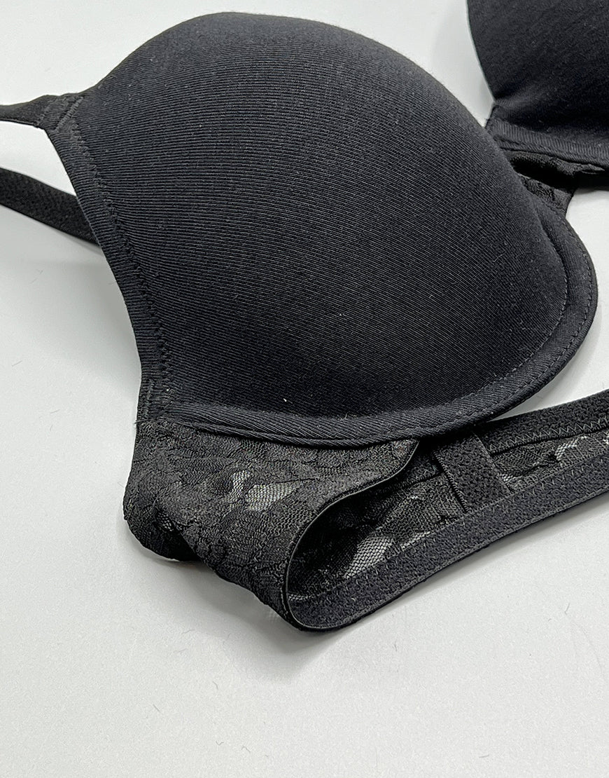 Dies ist ein sehr bequemer T-Shirt-BH mit Bügel. Er bietet 3/4-Cup-Abdeckung mit einlagigen Spitzenflügeln an den Seiten und am Rücken. Der BH hat einen tiefen V-Ausschnitt. Beide Cups sind in der Mitte mit doppellagiger Spitze für zusätzliche Stabilität verbunden.